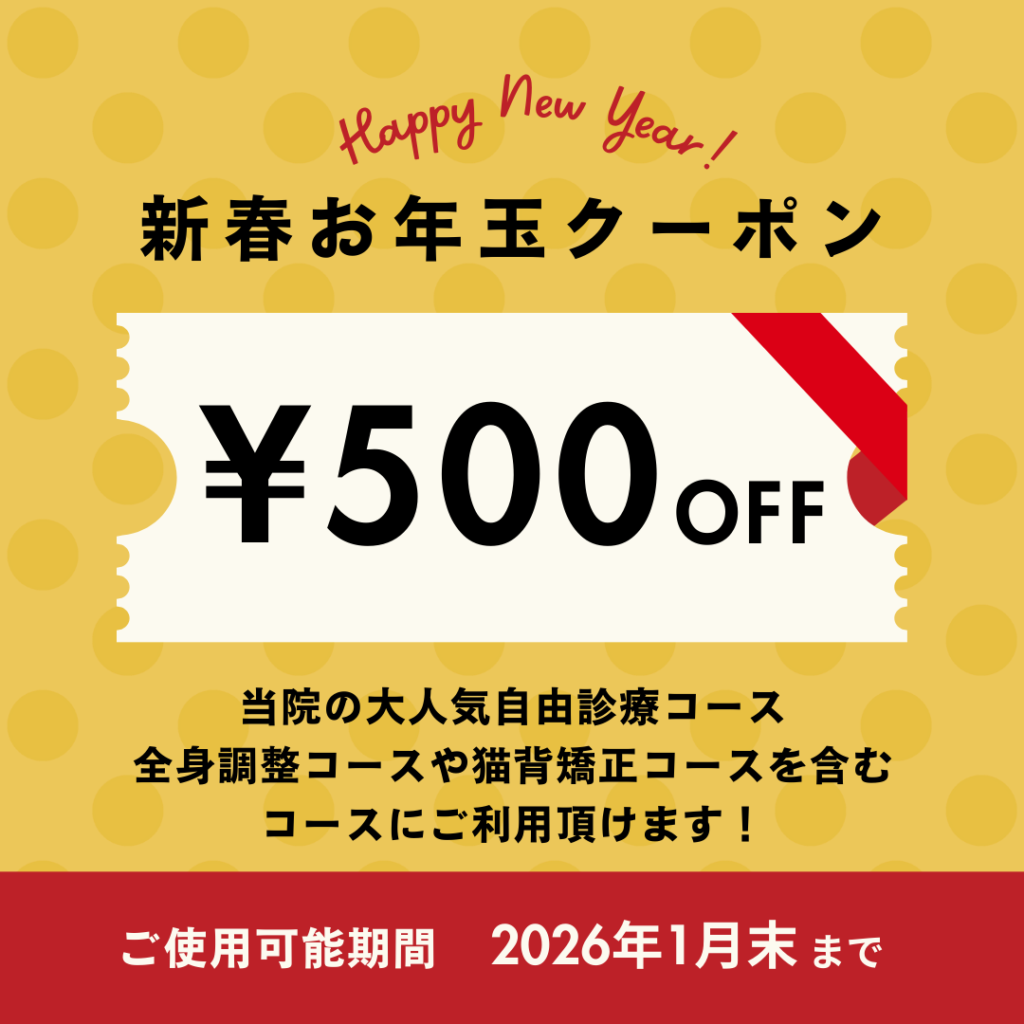 - 当院の自由診療コース(全身調整コース/産後トータルケアコース/ママケアコース/コアレ/猫背矯正コース/フットケアコース/美容鍼コース/ルート鍼コース/腸もみコース)にのみ適用可能です。